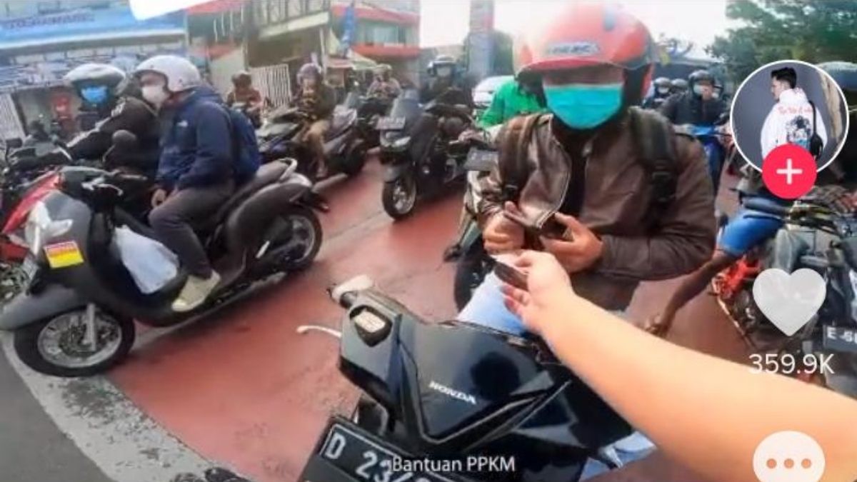 “Ini pak, bantuan PPKM, bantuan PPKM” ujarnya sambil memberikan selembar uang Rp.100.000 kepada setiap pengendara motor yang ia temui.