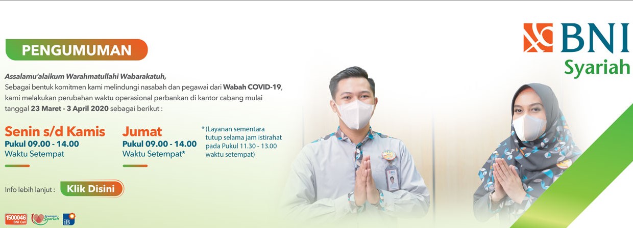 Selama masa antisipasi terkait Pandemi virus corona atau COVID-19, BNI Syariah menyarankan segenap nasabah menggunakan layanan E-Banking (BNI Mobile Banking, BNI SMS Banking, BNI Internet Banking).
