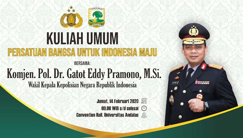 Satake Bayu mengatakan, materi kuliah umum yang akan dipaparkan oleh Wakapolri kelahiran Solok tersebut bertemakan persatuan bangsa untuk Indonesia maju.