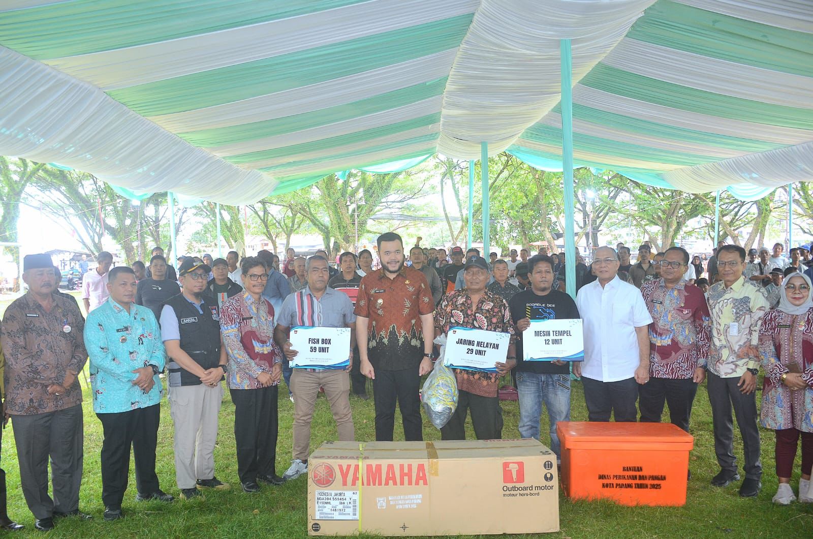 “Pada hari ini, kita menyerahkan bantuan berupa Mesin Tempel sebanyak 12 unit, terdiri dari kapasitas 40 PK sebanyak 7 unit dan 15 PK berjumlah 5 Unit. Selain itu Fish Box sebanyak 59 buah dengan kapasitas 220 liter sebanyak 29 buah, dan 100 liter berjumlah 30 buah. Bantuan selanjutnya yaitu Jaring Nelayan sebanyak 29 unit. Total penerima bantuan sebanyak 9 KUB di Kota Padang,” terangnya.