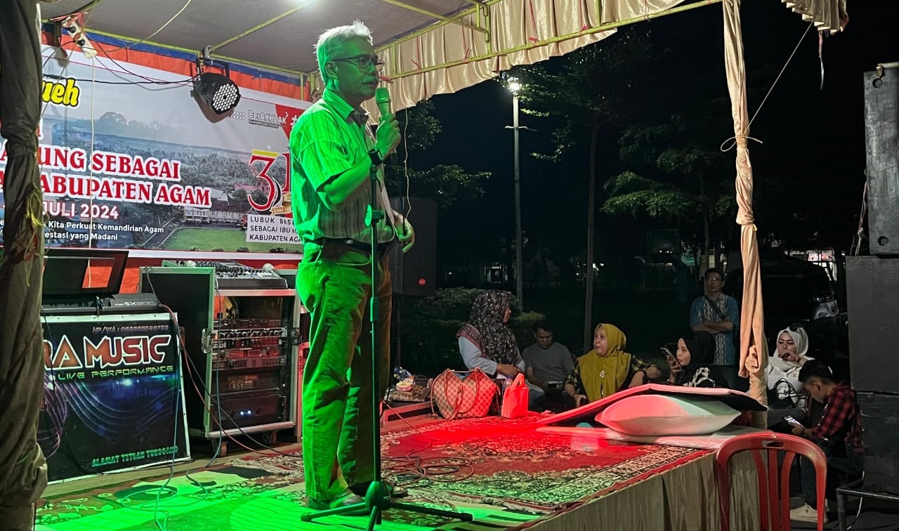 Langgam.id – Dalam rangka memeriahkan Hari Ulang Tahun (HUT) ke-31 Ibukota Kabupaten Agam di Lubuk Basung, Bupati Agam diwakili oleh Kepala Dinas Pekerjaan Umum dan Tata Ruang (PUTR) Kabupaten Agam, Ofrizon menghadiri acara Malam Kesenian Tradisional Saluang Klasik, di Lapangan GOR Rang Agam, Padang Baru, Lubuk Basung, Sabtu (20/7/2024) malam.