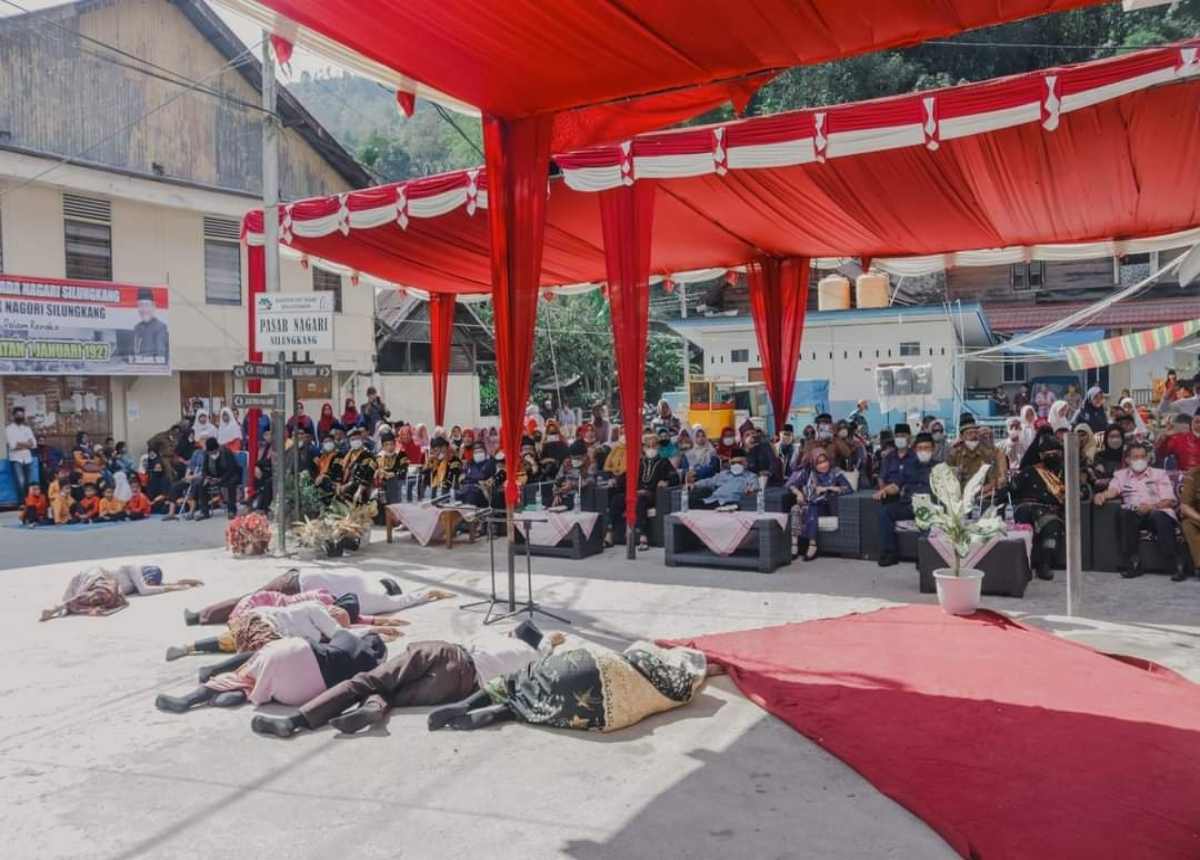 Langgam.id-Warga Kenagarian Silungkang, Kota Sawahlunto peringati perjuangan rakyat saat melawan Belanda di masa penjajahan. Acara dilaksanakan di kawasan Tugu Perlawanan Rakyat Silungkang di samping Pasar Silungkang, Selasa (4/1/2022).